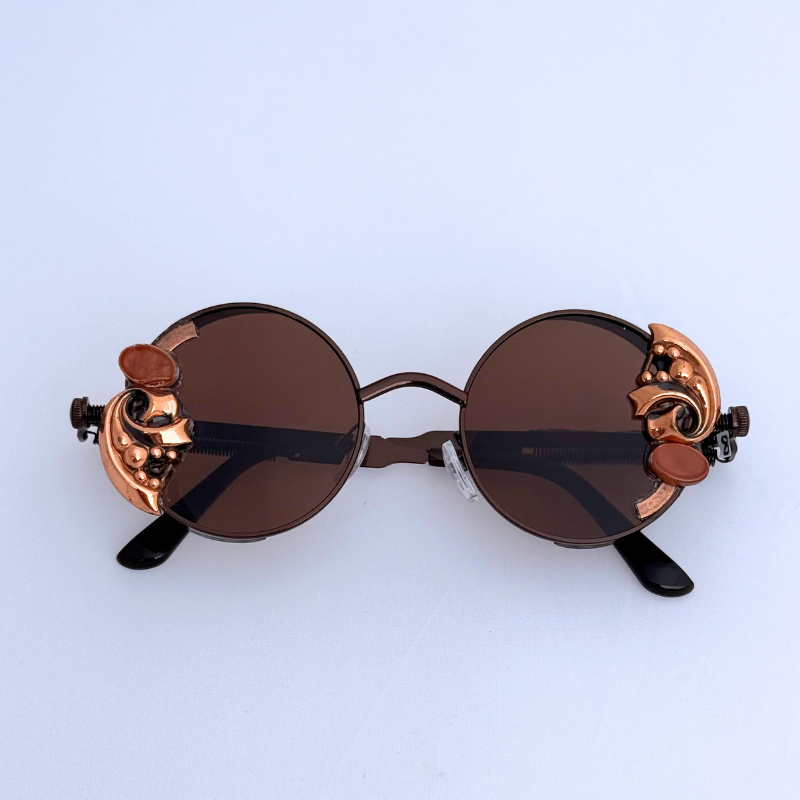 Deep bronze lenses framed in steampunk-inspired metal details with vintage copper embellishments and earthy stone accents. These round, balanced, asymmetircal shades blend industrial edge with godly warmth.