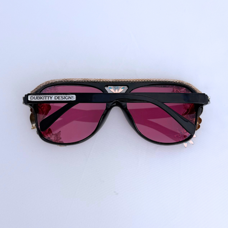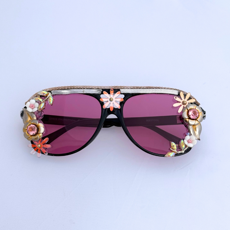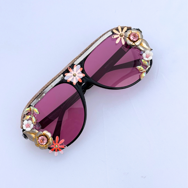 Vibrant pink lenses framed in black and crowned with jeweled vintage flowers, iridescent leaves, and gold accents that shimmer under the sun. These dreamy, mixed metal shades radiate festival goddess energy—playful, radiant, and free-spirited. Perfect for day or night playfulness.