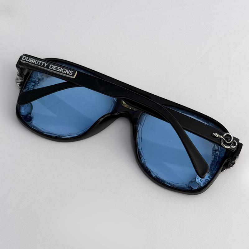 Cool blue aviator lenses paired with pearly silver moth sides, mother-of-pearl accents, a textured metallic wrap around, and a dainty snake charm on the arm. A dreamy, outlaw-meets-cosmic one-of-one with soft desert moon energy.