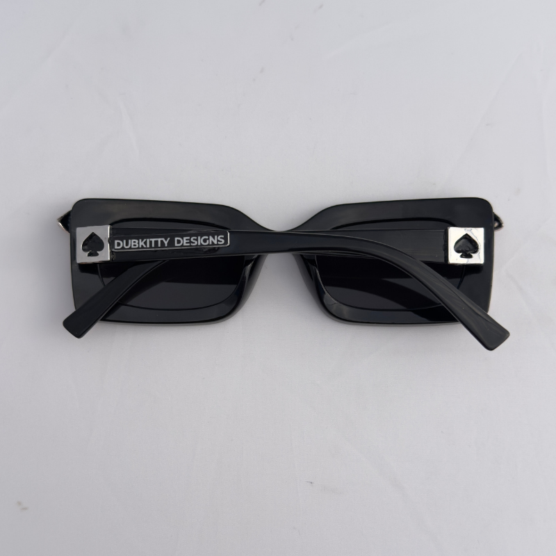 Dark, dimensional, and dangerously cool—these black rectangular frames feature dripping silver eyes and silver spade pieces on the sides that channel surreal rebellion. A statement piece for the visionary, the rebel, the one who sees everything and still keeps it mysterious.
