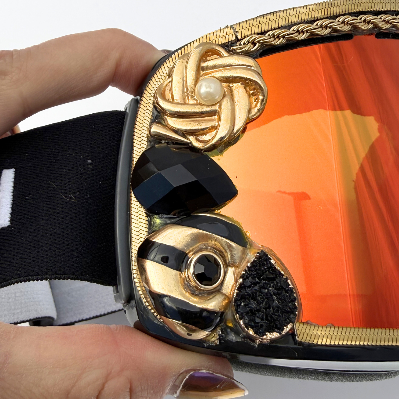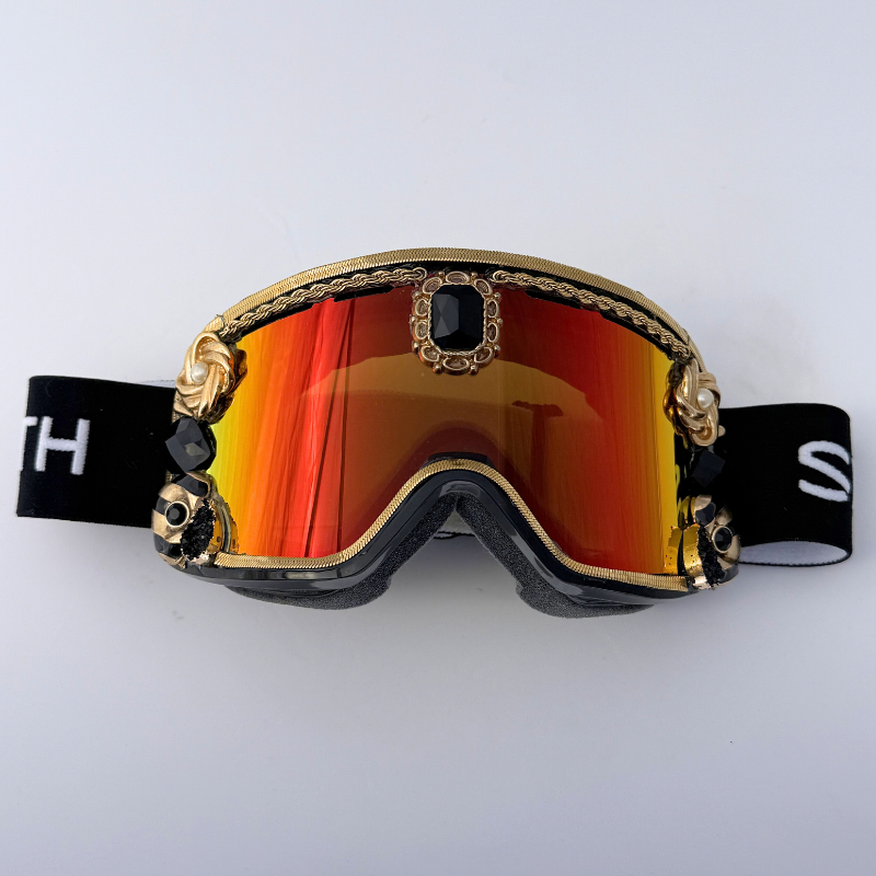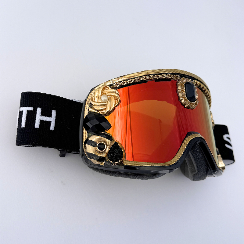 SMITH Range (medium) goggles w/ Red Sol-X lenses – great for everyday sunny & partly cloudy days. Decorated with black, gold & pearly vintage pieces sourced from antique shops and gold chains.