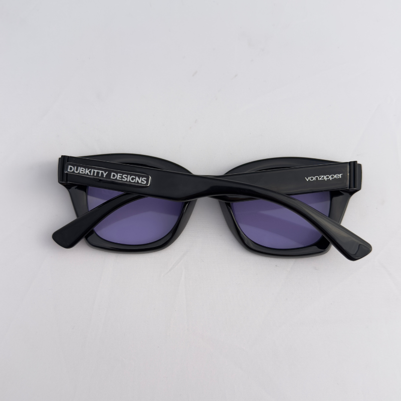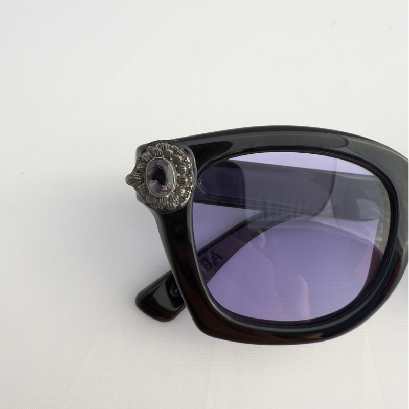 Artsy, classic black Von Zipper frames elevated with vintage amethyst gemstone accents on each side, paired with soft purple polarized lenses for a mysterious, luxe finish that can we born day or night. A one-of-a-kind pair that blends artistic allure with timeless elegance.