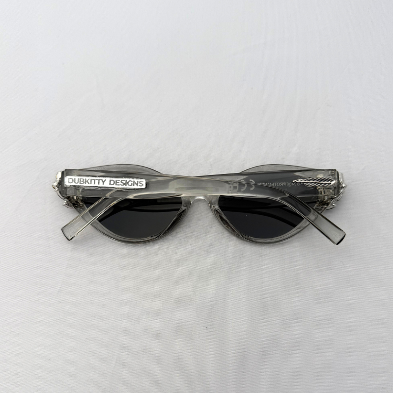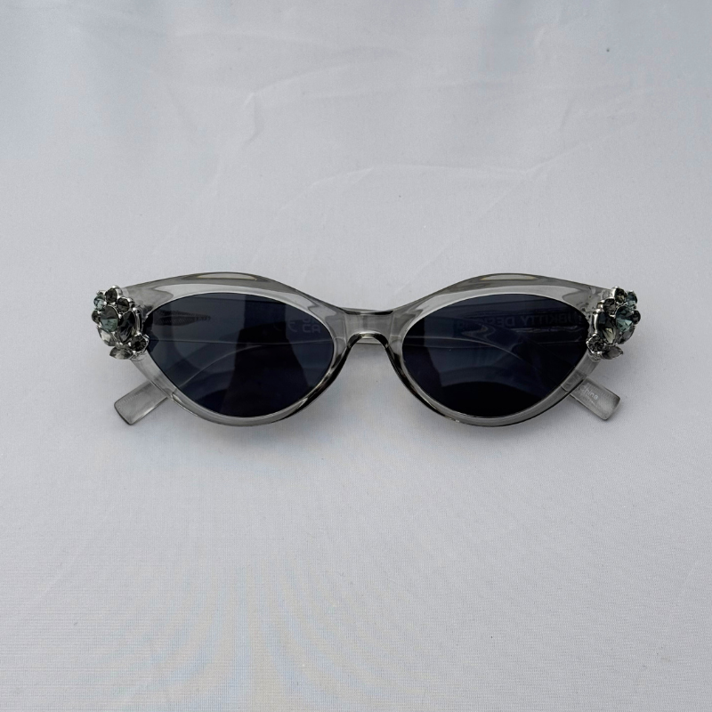 Sleek gray retro cat-eye shades accented with shimmering, vintage, charcoal colored floral gems. A subtle yet dazzling DubKitty classic to elevate your everyday look.