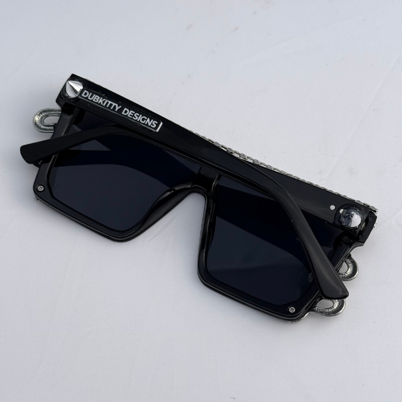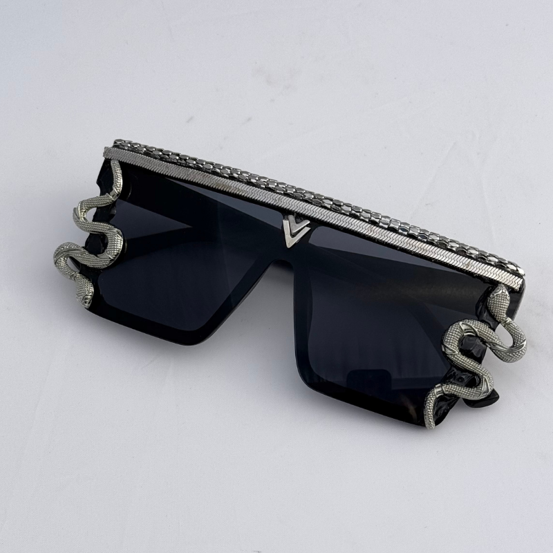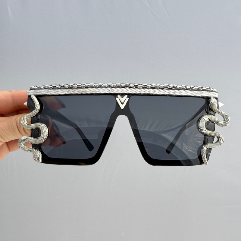 Edgy black shield frames crowned with metallic spikes and silver serpents that wrap with hypnotic precision. The dark lenses radiate power and mystery, giving off fierce dominatrix-meets-rockstar energy.