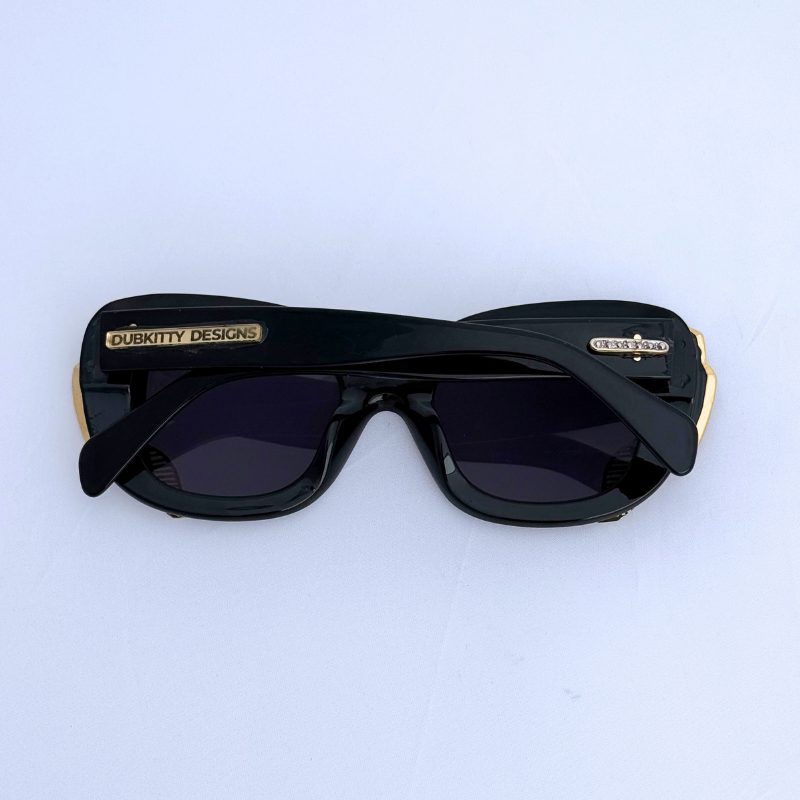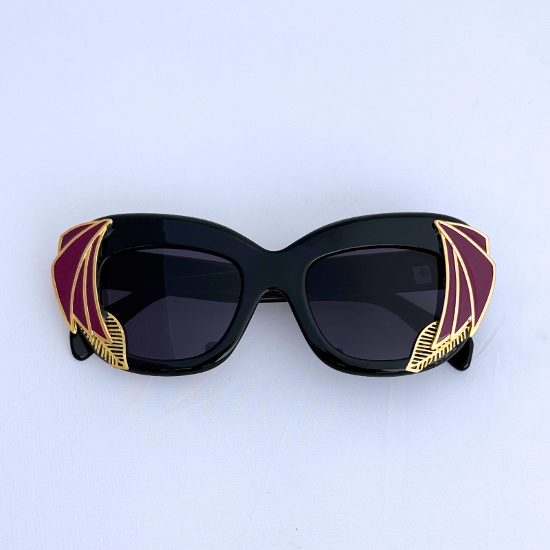 Glossy black, retro cat eye frames edged with pink and gold art deco wings for a look that screams high fashion. The dark lenses give off an air of mystery while the bold corners evoke old-Hollywood meets femme-fatale energy.